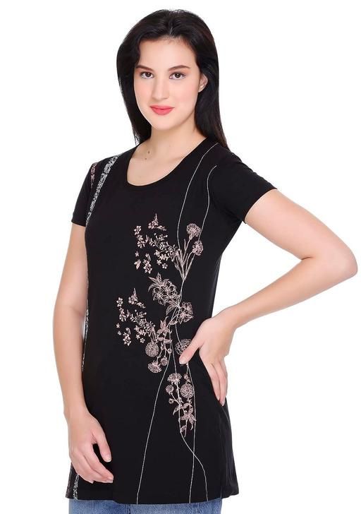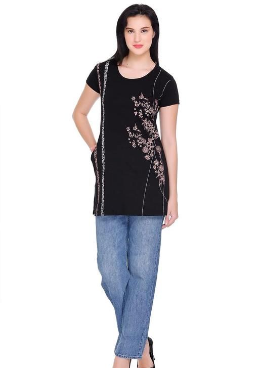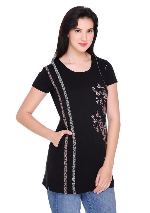 Name: Women's Cotton Printed Long Regular Fit Round Neck Top,T-Shirts (Black)|T-Shirt for women|printed t-shirt|long t-shirt|