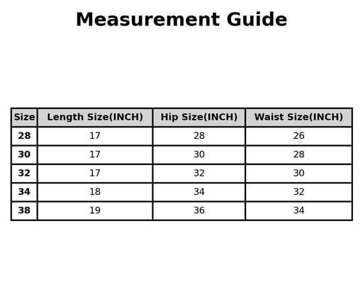 28 (Waist Size: 26 in, Hip Size: 28 in, Length Size: 17 in)