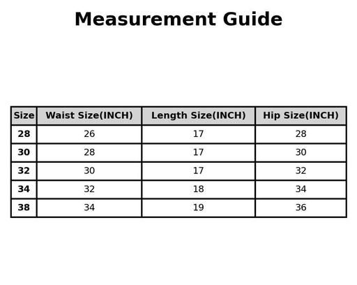 26, 28 (Waist Size: 26 in, Hip Size: 28 in, Length Size: 17 in)