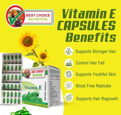 • SUPPLEMENT FOR HEALTHY SKIN, HAIR & IMMUNITY: Best Choice Nutrition Vitamin E is a supplement for skin care and hair care with potential immunity-enhancing properties. Take one Vitamin E capsule daily or as recommended by your dietician to avail its benefits • SKIN AGEING: Vitamin E Capsules helps protect the skin from the adverse effects of UV-induced oxidative stress while evening primrose oil helps restore a defective skin barrier and control water loss from the skin surface that improves skin smoothness and maintains youthful skin.