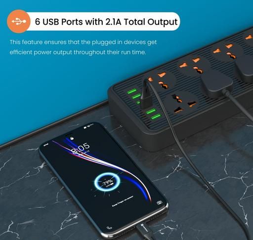 Name: Power Plate 7 with 6 USB Port + 8 Power Sockets Power Strip Extension Board with 2500W, 3Mtr Cord Length, 2.1A USB Output(Black)