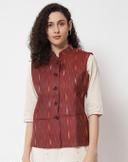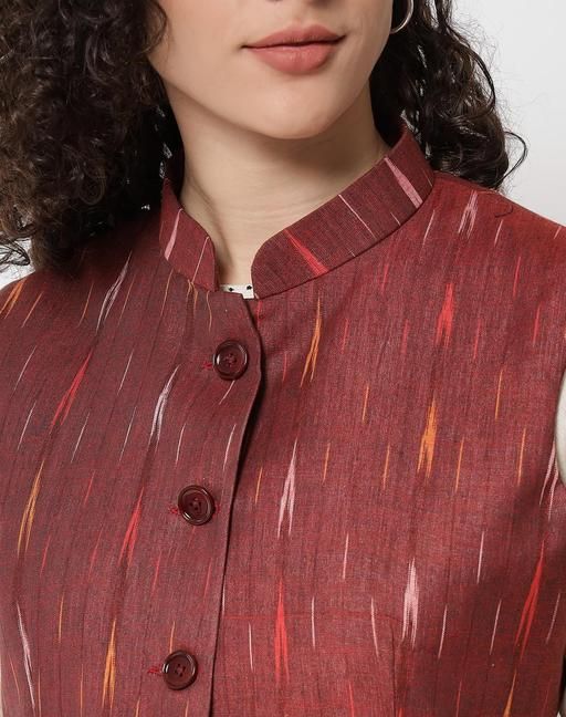 Elevate your fashion quotient with this top notch Nehru jacket with Vastraa Fusion. Pair it up with a kurti and churidar to complete the ensemble. Maroon ikat printed woven Ladies Nehru Jacket, has a mandarin collar, sleeveless, single breasted with button closure, two welt pockets and straight hem