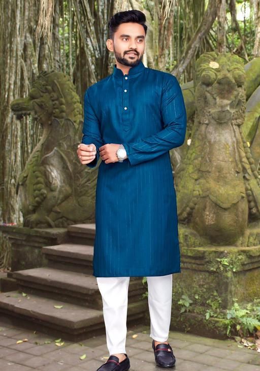 This traditional Indian kurta pajama set includes a top (kurta) with and a bottom (Pajama). Loose fitting sleeves and slits along the sides allow for an easy fit and let air circulate freely through the garment. The pant included in this kurta pajama set has a relaxed fit through the seat and legs for absolute comfort. regular comfortable fitting makes it a great wear.