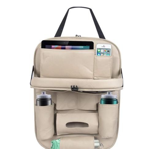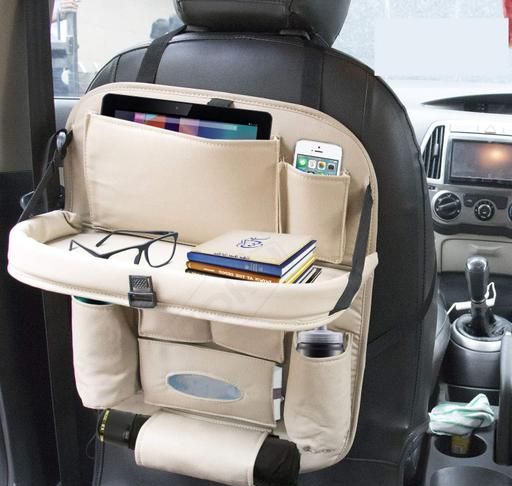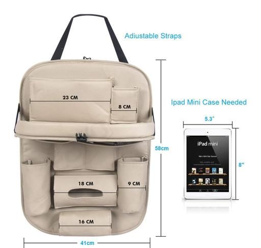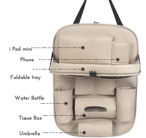 Multiple storage compartments including pockets to keep items in view. · Tablet sleeve gives you the freedom to keep large devices safe and secure. · Protects back seat from kicks and spills. · Made of Luxury PU Leather fabric for safety and reliability. · Bottle pockets keep your child's favorite drink within reach, not on the floor. · Make trips with the family fun and stress-free with this backseat organizer. · Keeps your car organized and free from clutter and mess. · Fit most seat : Top adjustable buckles fits most vehicle seats. Specifications: Pockets: · 1 Tablet sleeve (up to 5.3") · 2 small pockets for small things (like phone, pens, purse/wallet etc.) 2 bottle pockets and 1 tissue box pocket · 1 bigger pocket for document, toys, towels etc. · 1 umbrella holder · 2 Adjustable straps for both top and bottom section to secure the organizer in place Backseat Organizer Size: H 23.6" x L 16.5" (56.9 cm x 40.9 cm) Material: High Quality PU Leather Care: Wipe clean with soft cloth. Country of Origin : India