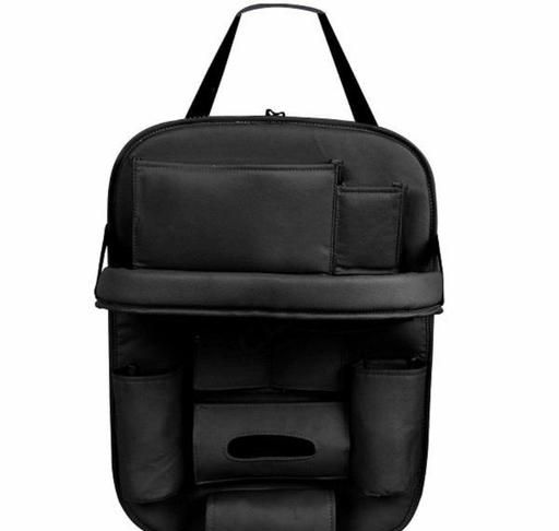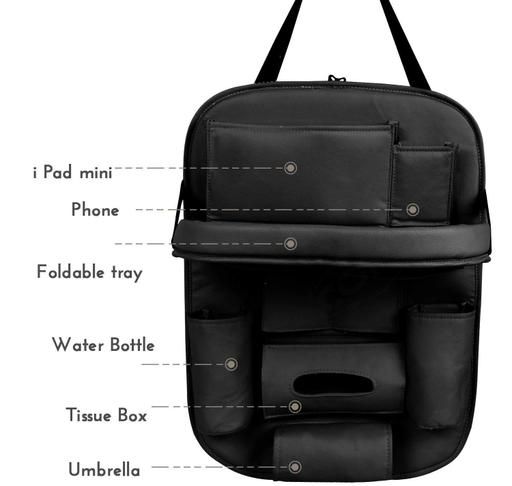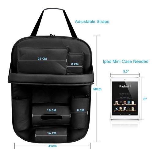 Multiple storage compartments including pockets to keep items in view. · Tablet sleeve gives you the freedom to keep large devices safe and secure. · Protects back seat from kicks and spills. · Made of Luxury PU Leather fabric for safety and reliability. · Bottle pockets keep your child's favorite drink within reach, not on the floor. · Make trips with the family fun and stress-free with this backseat organizer. · Keeps your car organized and free from clutter and mess. · Fit most seat : Top adjustable buckles fits most vehicle seats. Specifications: Pockets: · 1 Tablet sleeve (up to 5.3") · 2 small pockets for small things (like phone, pens, purse/wallet etc.) 2 bottle pockets and 1 tissue box pocket · 1 bigger pocket for document, toys, towels etc. · 1 umbrella holder · 2 Adjustable straps for both top and bottom section to secure the organizer in place Backseat Organizer Size: H 23.6" x L 16.5" (56.9 cm x 40.9 cm) Material: High Quality PU Leather Care: Wipe clean with soft cloth. Country of Origin : India