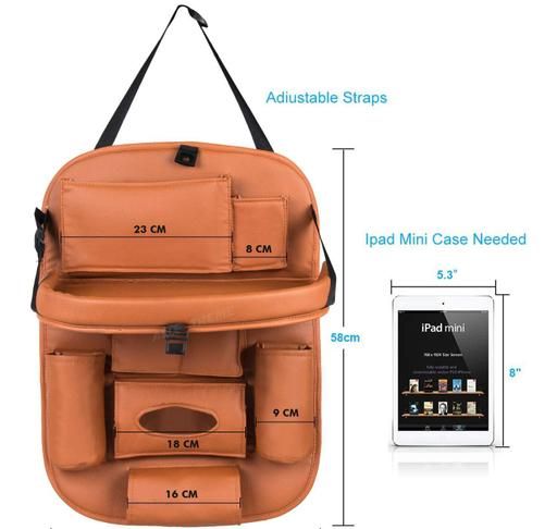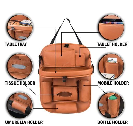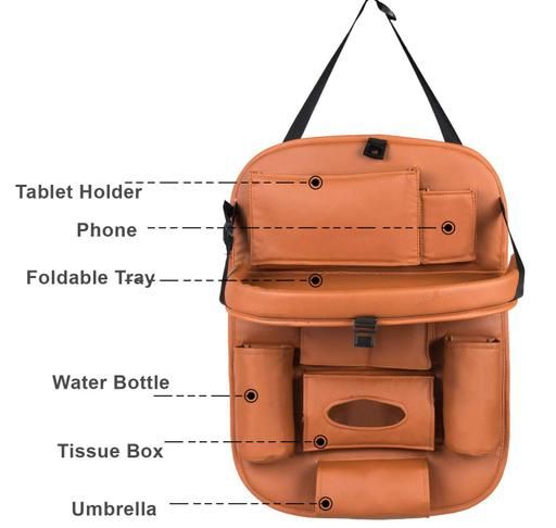 Multiple storage compartments including pockets to keep items in view. · Tablet sleeve gives you the freedom to keep large devices safe and secure. · Protects back seat from kicks and spills. · Made of Luxury PU Leather fabric for safety and reliability. · Bottle pockets keep your child's favorite drink within reach, not on the floor. · Make trips with the family fun and stress-free with this backseat organizer. · Keeps your car organized and free from clutter and mess. · Fit most seat : Top adjustable buckles fits most vehicle seats. Specifications: Pockets: · 1 Tablet sleeve (up to 5.3") · 2 small pockets for small things (like phone, pens, purse/wallet etc.) 2 bottle pockets and 1 tissue box pocket · 1 bigger pocket for document, toys, towels etc. · 1 umbrella holder · 2 Adjustable straps for both top and bottom section to secure the organizer in place Backseat Organizer Size: H 23.6" x L 16.5" (56.9 cm x 40.9 cm) Material: High Quality PU Leather Care: Wipe clean with soft cloth. Country of Origin : India