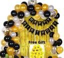 Name: Herdem Birthday Decoration Combo Set of Happy Birthday Black Banner, 30 Metallic Balloons (Black, Golden and Silver), Golden Curtains-2 pcs and free gift 5 pcs Smiley Emoji Balloons Combo kit