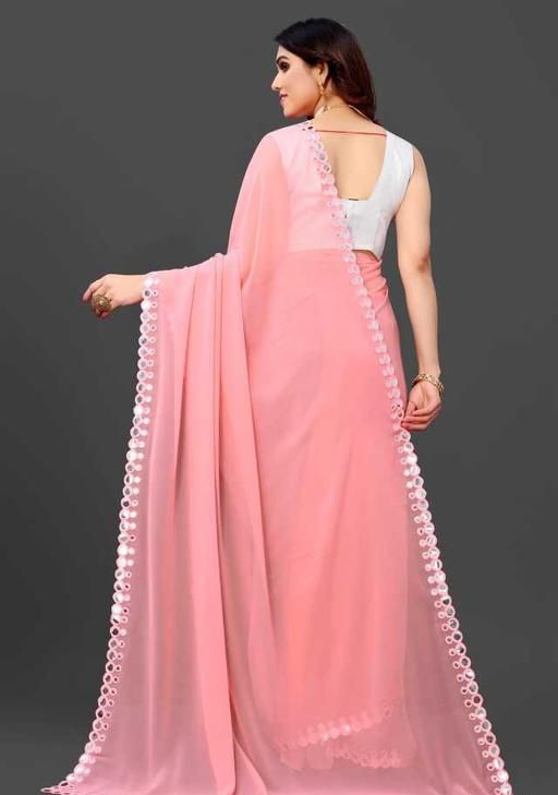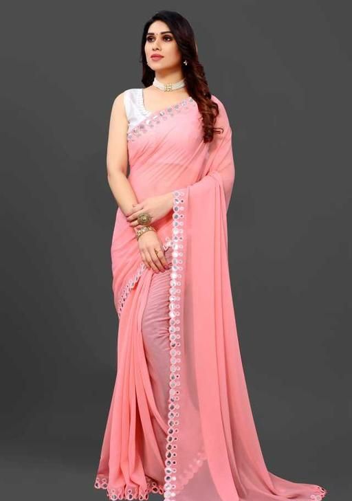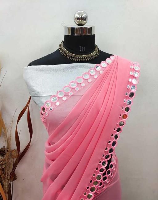 This is a Faux Georgette Plastic Mirror work Party Wear Saree.This Saree comes with an attached Art Silk blouse fabric which can be customised from 32" to 42