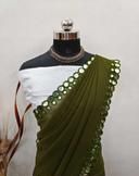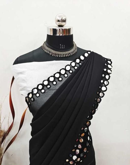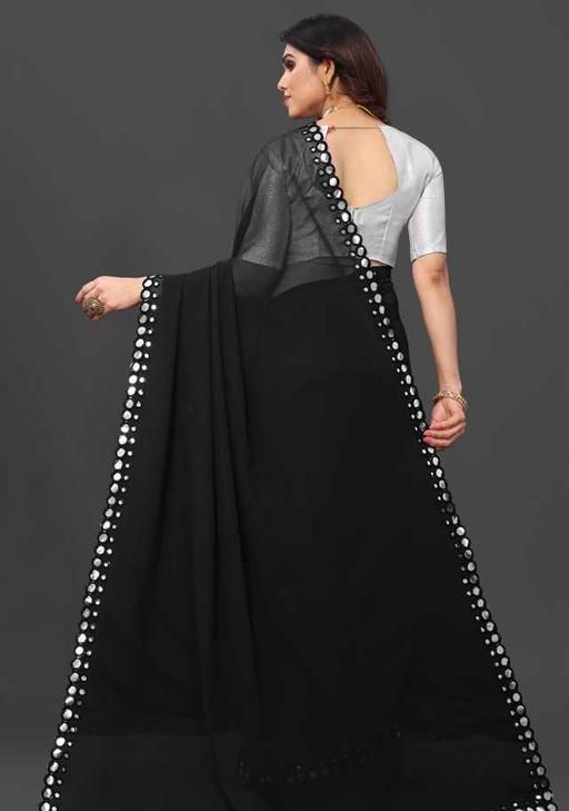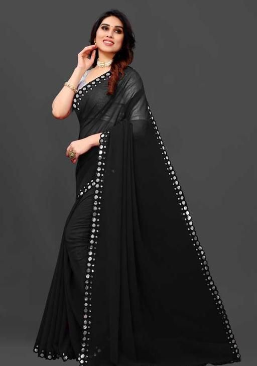 This is a Faux Georgette Plastic Mirror work Party Wear Saree.This Saree comes with an attached Art Silk blouse fabric which can be customised from 32" to 42