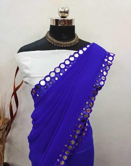 This is a Faux Georgette Plastic Mirror work Party Wear Saree.This Saree comes with an attached Art Silk blouse fabric which can be customised from 32" to 42
