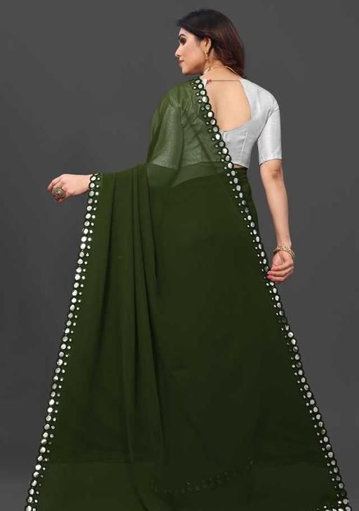 This is a Faux Georgette Plastic Mirror work Party Wear Saree.This Saree comes with an attached Art Silk blouse fabric which can be customised from 32" to 42