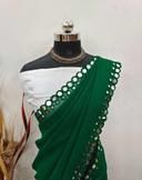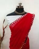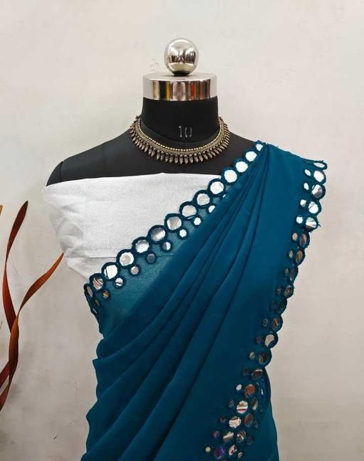 This is a Faux Georgette Plastic Mirror work Party Wear Saree.This Saree comes with an attached Art Silk blouse fabric which can be customised from 32" to 42
