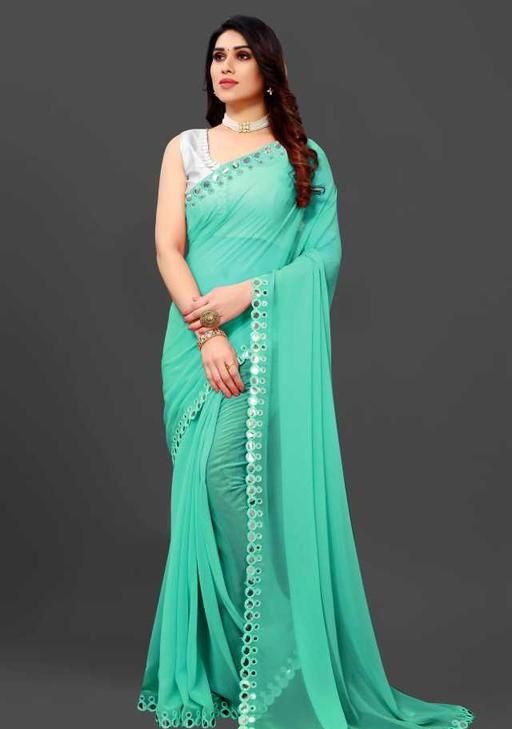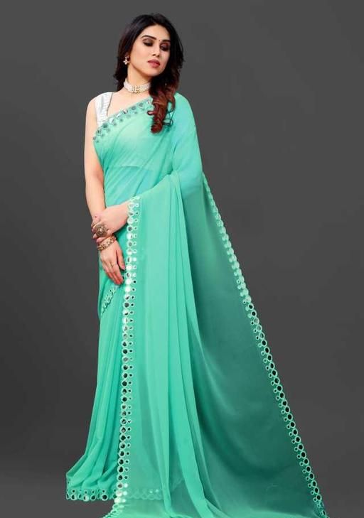 This is a Faux Georgette Plastic Mirror work Party Wear Saree.This Saree comes with an attached Art Silk blouse fabric which can be customised from 32" to 42