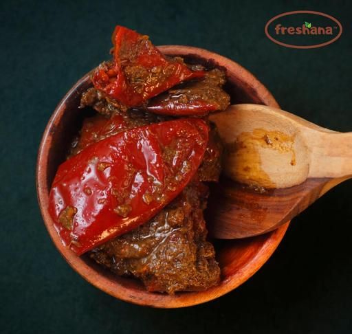 To make your meals flavourful, here we present our teekha, tangy, and homemade, “Lal mirchi ka Achar.” Lal mirchi stuffed with teekha masala filling, this achar has a spicy, mouth-watering flavour. Freshana Foods does not add any preservatives to pickle, as we believe mustard oil is the best natural preservative to keep your aachar fresh and delicious. Freshana Foods serves homemade, additive-free red chilli pickle, and you ought to try this lal mirchi ka achar at least once to enhance the flavour of your meal.