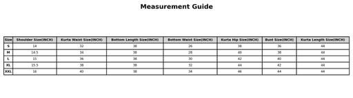 XXS (Bust Size: 32 in, Shoulder Size: 13 in, Kurta Waist Size: 32 in, Kurta Hip Size: 34 in, Kurta Length Size: 42 in, Bottom Waist Size: 24 in, Bottom Length Size: 38 in)
