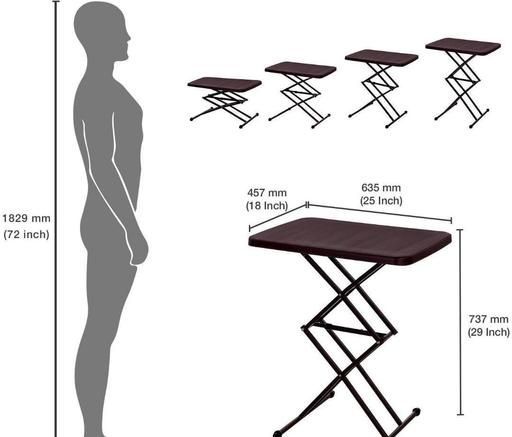 Product Dimensions : 64.5 cm x 45.5 cm x 73.5 cm ? Bottom Material: Powder coated mild steel, Top Base Material: High-grade polymer; Style: Contemporary MULTIPURPOSE USE - Useful for ironing, camping, enjoying family time in the living room, outdoor activity, garden, and also as a computer table, portable study table for kids, bed table, height-adjustable work from home laptop table for adults, etc. This Table have 5 different height adjustable quality along with small push button in it, so that you can always find the table height according to your convenient. It is heavy duty, ergonomic and space saving design which constructed with Blow moulding technology. ASSEMBLY REQUIRED - Assembly Required the product is delivered in a pre-assembled state, Only minor assembly is required. You can adjust the height of the laptop desk by just pressing a single button. Weatherproof easy to clean table that can be used both indoors and out. Just wipe clean with soft cloth to maintain for a long time to come.