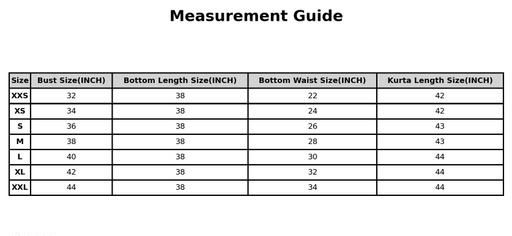 XXS (Bust Size: 32 in, Shoulder Size: 12.5 in, Kurta Waist Size: 32 in, Kurta Length Size: 42 in, Bottom Waist Size: 26 in, Bottom Hip Size: 32 in, Bottom Length Size: 36 in)
