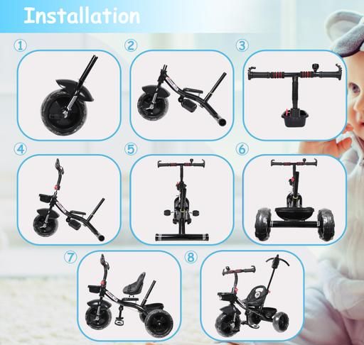 The product contains accessories like bell , seat belt , parent handle , storage baskets . Weight 4 kg and 50 x40x30cm in dimension.