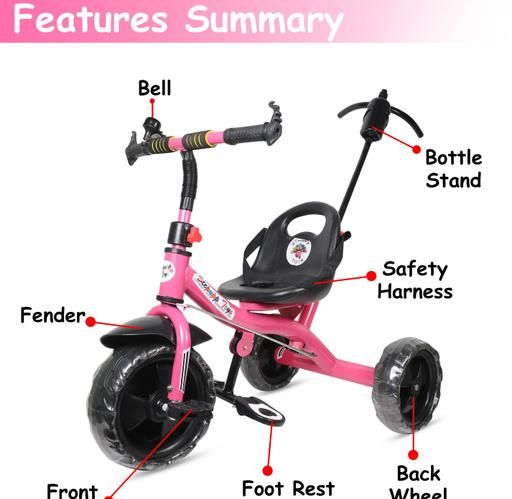 Rubber grip handles for the better grip of your toddler. Backrest to make your child sit comfortably. A unisex product and made up of iron and steel . Recommended for kids between 2 years to 5 years age.