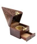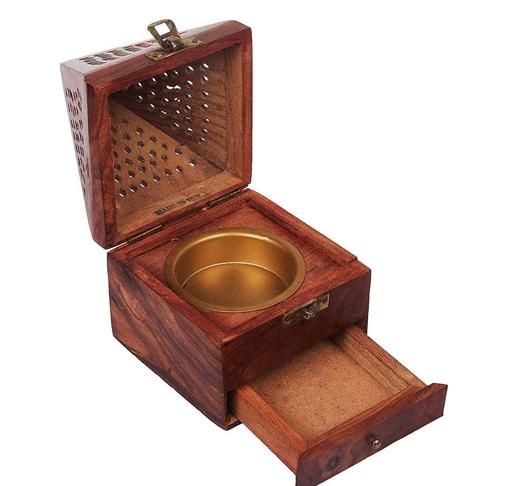 M.A Handicrafts The intricate floral carvings on the incense holder have been meticulously crafted by skilled artisans. The holder features two brass pots to place your incense cones and holes on both sides to insert incense sticks. The lid of the incense holder has a cut-out to allow the aroma to spread, and there is also a hidden compartment below the holder to keep the incense fresh and fragrant. This incense holder makes a perfect gift for any occasion, as it combines beauty and functionality in one piece.