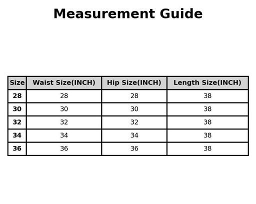 24, 26, 28 (Waist Size: 28 in, Length Size: 38 in, Hip Size: 28 in)
