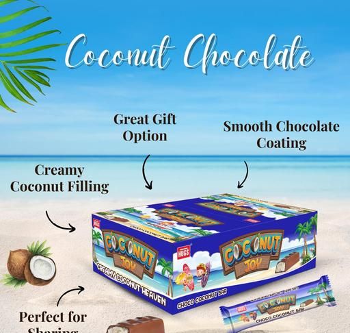 - Hugs Carlos Coconut Chocolate Bar has the goodness of real coconut flakes in creamy coconut filling covered with velvety chocolate.