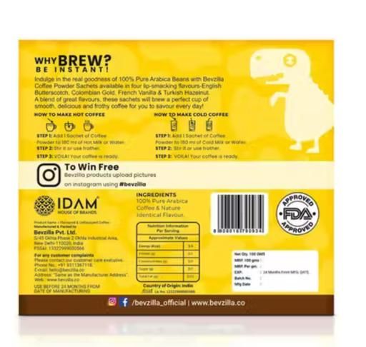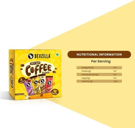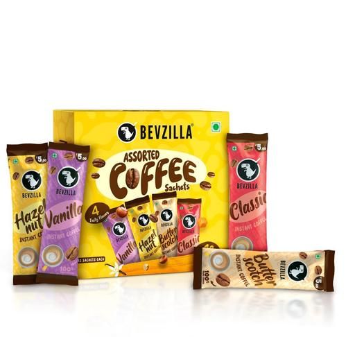 "Indulge in the real goodness of 100% Pure Arabica Beans with Bevzilla Coffee Powder Sachets available in four lip-smacking flavours- English Butterscotch, Colombian Gold, French Vanilla & Turkish Hazelnut.