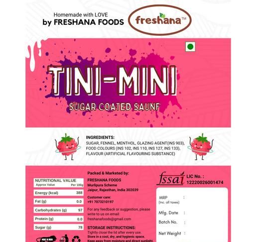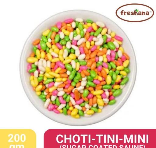 Freshana Mouth Freshener Tini-Mini Saunf 200G Tinimini Flavoured Sugar coated Fennel Seeds Candy Prepared using the finest quality hand picked ingredients and traditional recipe to ensure flavour and quality Processed & packed under hygienic environment Sugar Coated Fennel Seeds/Fennel Candy/Sugar Coated Saunf A good treat to savour after your meal. Delicious and healthy They are not only great in taste, but also help in increasing hunger and boost the digestive process. It activates the secretion of digestive juices in right proportion thus increases appetite. A perfect after meal digestive with a sweet & sour taste. Sortex Cleaned and Superior Quality Consistency in taste, aroma and quality across the year Hygienic packing and best quality control processes