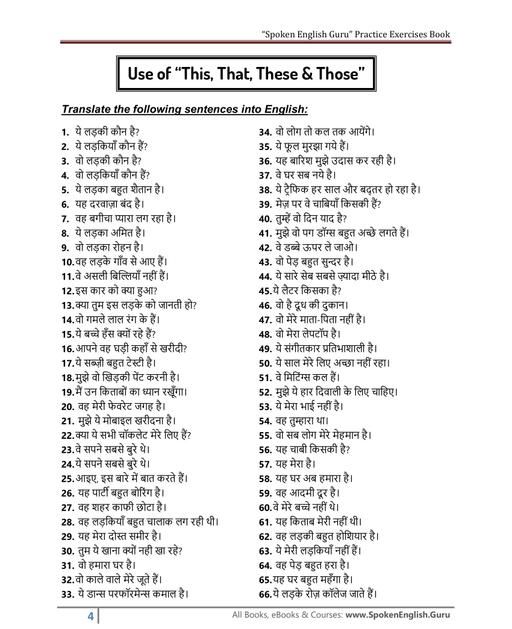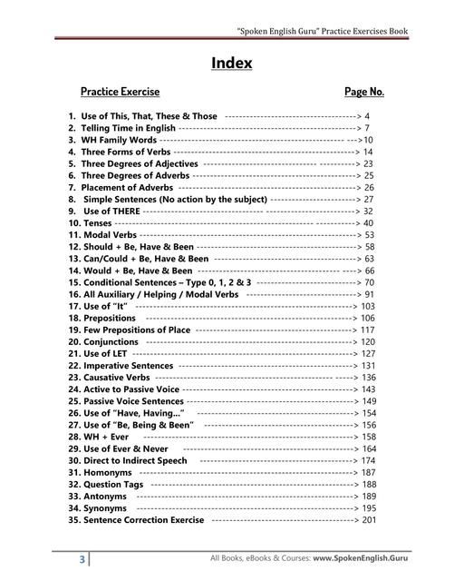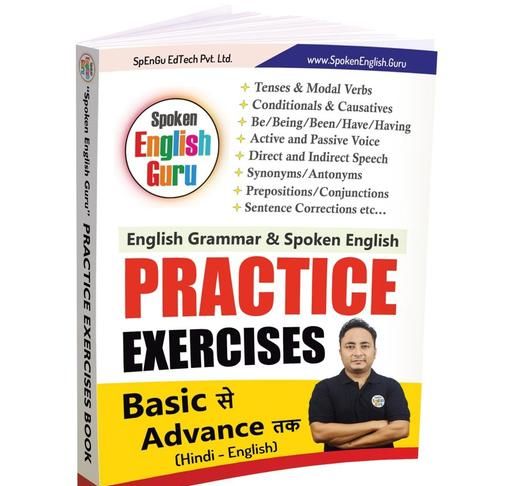 This practice book contains Grammar and Spoken English practice exercises in Hindi and English language from basic level to advance level in a proper lesson-wise sequence, i.e., (1) This, That, These & Those, (2) What is the time?, (3) WH Family Words in English, (4) Three Forms of Verbs, (5) Three Degrees of Adjectives, (6) Three Degrees of Adverbs, (7) Placement of Adverbs, (8) Simple Sentences (No action by the subject), (9) Use of THERE, (10) All Tenses, (11) All Modal Verbs, (12) Should + Be, Have & Been, (13) Can/Could + Be, Have & Been, (14) Would + Be, Have & Been, (15) Conditional Sentences – Type 0, 1, 2 & 3, (16) All Auxiliary/Helping/Modal Verbs, (17) Use of IT, (18) All Prepositions, (19) Few Prepositions of Places, (20) All Conjunctions, (21) Use of LET, (22) Imperative Sentences, (23) Causative Verbs, (24) Active to Passive Voice, (25) Passive Voice, (26) Use of Have & Having, (27) Use of Be, Being & Been, (28) WH + Ever, (29) Use of Ever & Never, (30) Direct to Indirect Speech, (31) Homonyms, (32) Question Tags, (33) Antonyms, (34) Synonyms, (35) Sentence Correction Exercise.