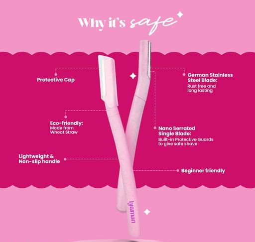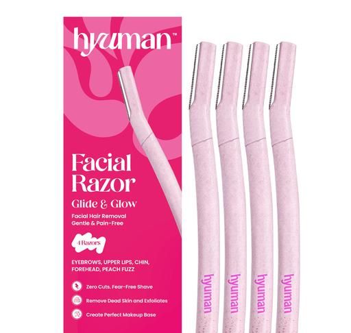 Hyuman Face Razor offers safe and gentle facial hair removal with a nano-serrated German stainless steel blade for smooth, precise shaving. Its ergonomic handle ensures easy control, while the protective cap keeps it hygienic. Ideal for eyebrows, upper lip, and peach fuzz, it also exfoliates dead skin, leaving a smooth base for flawless makeup.