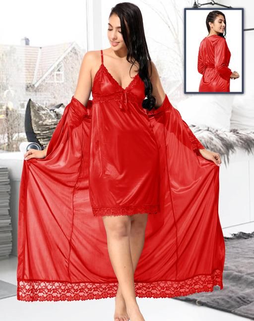 Name: Jerry nightwear Women's Satin Short Length Nighty with full length Robe _Nightwear Set Pack of 2_(Red)(Ds. 10038)