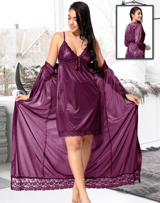 Name: Jerry nightwear Women's Satin Short Length Nighty with full length Robe _Nightwear Set Pack of 2_(Purple)(Ds. 10038)