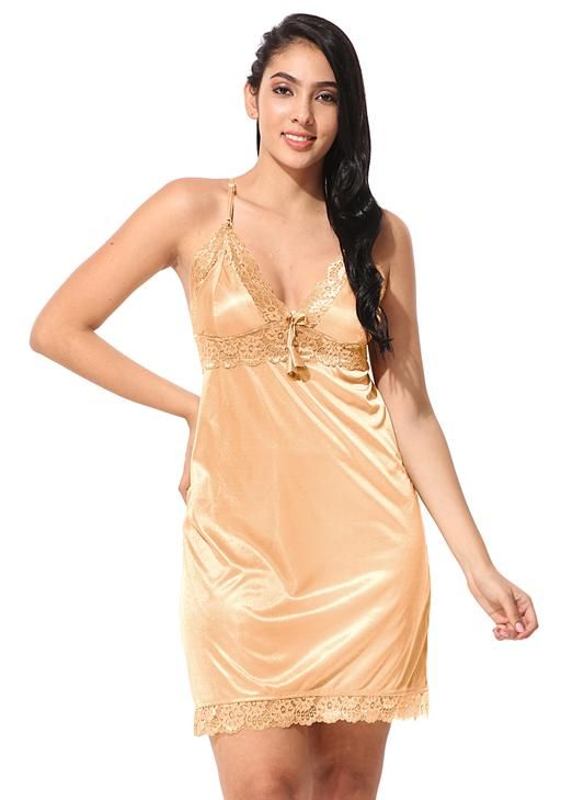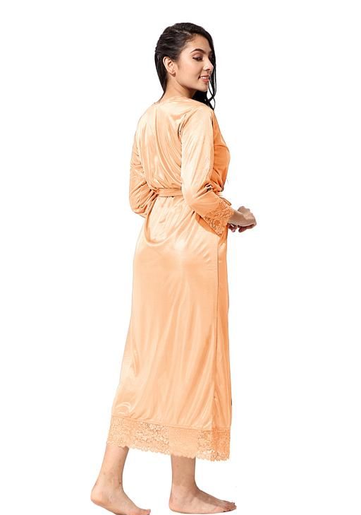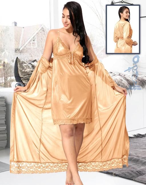 Name: Jerry nightwear Women's Satin Short Length Nighty with full length Robe _Nightwear Set Pack of 2_(Golden)(Ds. 10038)