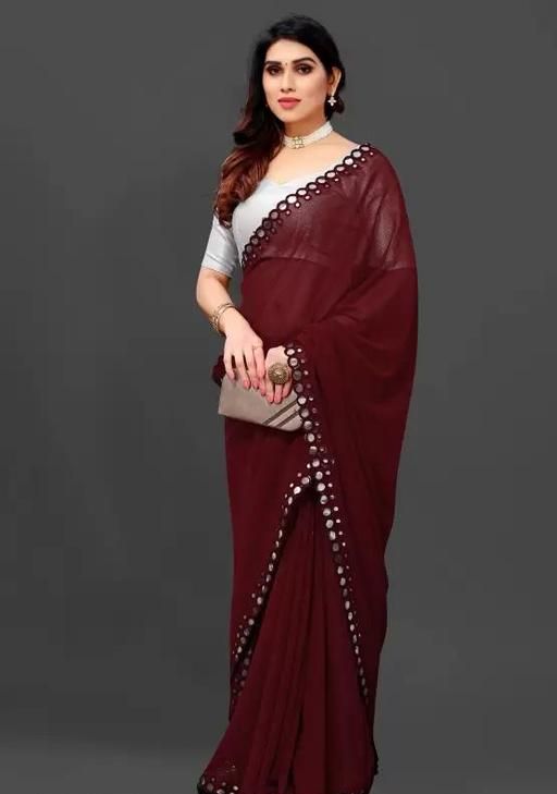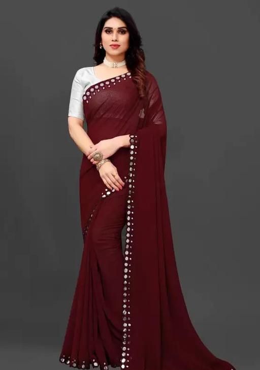 This is a Faux Georgette Plastic Mirror work Party Wear Saree.This Saree comes with an attached Art Silk blouse fabric which can be customised from 32" to 42