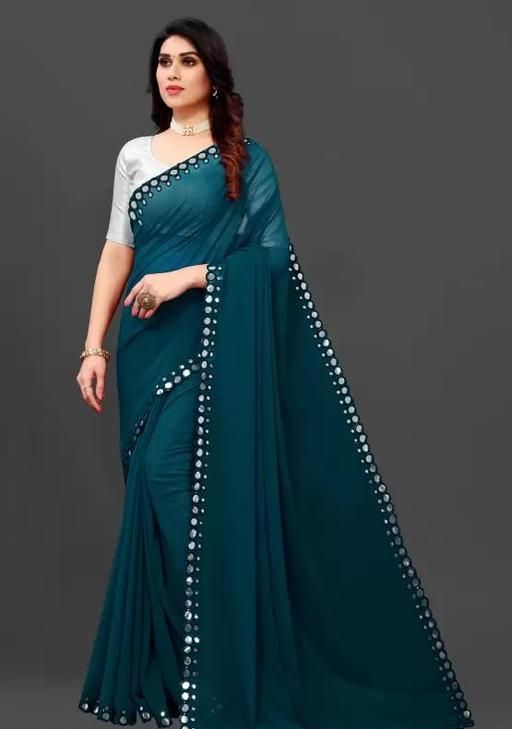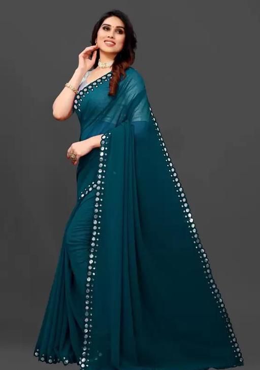 This is a Faux Georgette Plastic Mirror work Party Wear Saree.This Saree comes with an attached Art Silk blouse fabric which can be customised from 32" to 42
