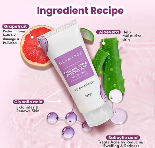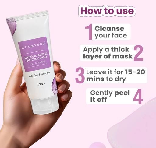 "Product Name: Glamveda Glycolic & Salicylic acid Anti Acne Peel off Mask For Women | Reduces Blackhead & Pore care | For Oily & Acne Prone Skin | No Paraben, SLS | 100gm Brand Name: Glamveda Type: Masks & Peels Net Quantity (N): 1 The glycolic acid & salicylic acid anti-Acne face peel off mask is best suited for those who have oily skin and face, frequent acne breakouts. The peel off mask unclogs pores, protect and brighten your skin. It balances the sebum levels in the skin. The natural ingredients present in the peel off mask help in balancing the excess oils and improves the elasticity of the skin making it less prone to open pores, scars and acne. The fruit extracts included in the formulation hydrates the skin, restore the moisture, the dullness and improve the skin texture. Country of Origin: India"