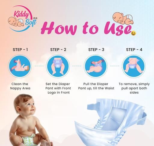Kiddysoft diapers features an ultra-absorb core which locks in wetness along with a layer of super absorbent wetness which repels any moisture for as long as 12 hours. Keep your baby dry with these diapers from kiddysoft. It gives your little one comfort without any skin irritation or rashesso that your child can spend more of its time in learning new activities. The diaper doesn't get heavy with the crisscross top layer that creates a lager absorbing area and helps in uniform liquid distribution.Kiddysoft Pant Diapers are available inSmall(S), Medium (M), Large (L) and Extra Large(XL) with free gift of 1-pair of BABY SOCKS Pant are specially designed to make your baby feel comfortable, so that they can play and learn new things.