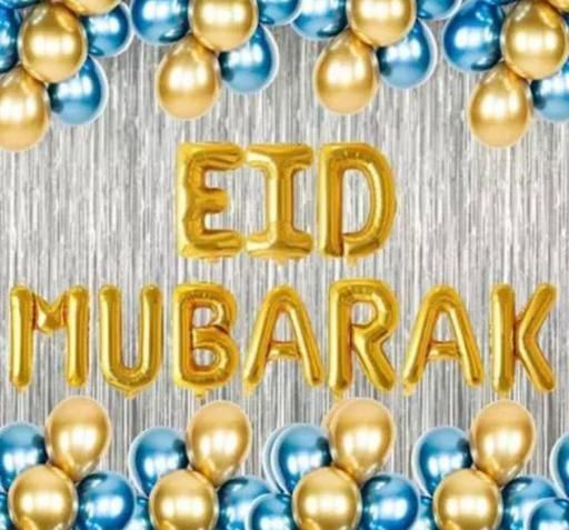 Eid Mubarak | 10 Alphabets Foil "EID MUBARAK", 1 Silver Curtains, 20 Metallic Balloons (Golden 15 Blue 10 combo’s