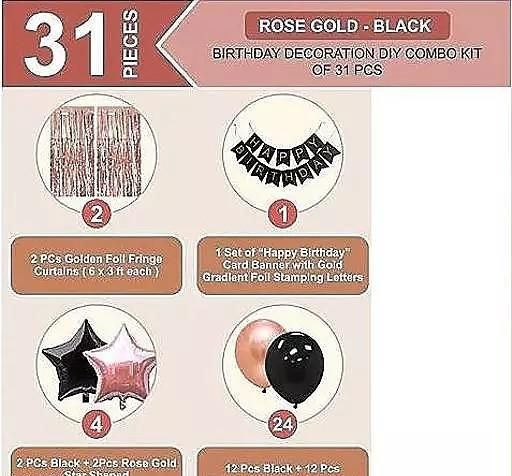 Name: Rose Gold Happy Birthday Decoration Combo Kit for Girls 31 Pcs with Foil Curtains, HBD Banner, Star Shaped & Metallic Balloons (Rose Gold - Black)