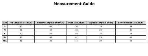L (Bust Size: 40 m, Top Length Size: 40 m, Bottom Waist Size: 36 m, Bottom Length Size: 40 m, Dupatta Length Size: 2.4 m, Shoulder Size: 15 m)