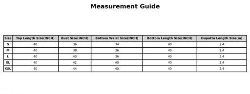 L (Bust Size: 40 in, Top Length Size: 40 in, Bottom Waist Size: 36 in, Bottom Length Size: 40 in, Dupatta Length Size: 2.4 in, Shoulder Size: 13 in)