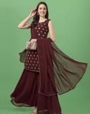 pure blooming georgette sequinned embroidered sharara set with dupatta is a beautiful ethnic wear option that you can style on so many occasions. This ethnic kurta sharara set has full flared straight sharara with solid georgette dupatta having tapping lace border details. This graceful garment set comprises a kurti and sharara and is often accompanied by a dupatta or ethnic jacket. Purchasing a set makes styling an easy task, as it would comprise both the top and the bottomwear to create a complete outfit.