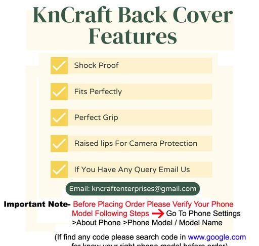 KnCraft's Disclaimer:- Hello Friend the mobile cover you will get when you order it may look a little bit different in color because image of the cover is taken in high lights so you may find the color a little different but don't worry about it, you will like this cover. About KnCraft's Cover Material and Features:- This Cover is made from Silicone and Rubber and Printed By UV Printing Machine. Cover Features- This Cover is Soft, Flexible, Light Weight and Perfect Fitting Mobile Cover. Raised Edges and Lips- For Protect Phone's Screen and Camera from Rubbing Against Flat Surface and Protect Phone Against- Shocks, Dents, Scratches, Dust, Breaks and Stains. Exclusively Designed By KnCraft, Made in India- Buy now.