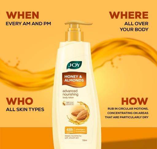 Joy Honey & Almonds Advanced Nourishing Body Lotion has a perfect balance of Almond Oil and Honey along with Vitamin E to provide deep nourishment and moisturisation to keep your skin soft, smooth, healthy and glowing naturally. The Joy skin care product also reduces fine lines and wrinkles.