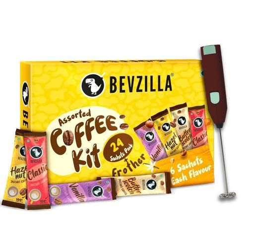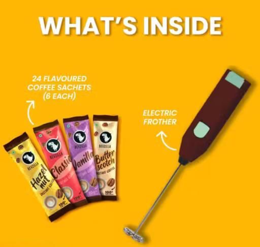 The Ultimate Coffee Kit - Enjoy a cafe-like experience at home with this Ultimate Coffee Kit! Get 24 flavored coffee sachets available in four lip-smacking flavors: Butterscotch, Colombian Gold, French Vanilla & Hazelnut, along with an electric frother to make your coffee extra creamy!