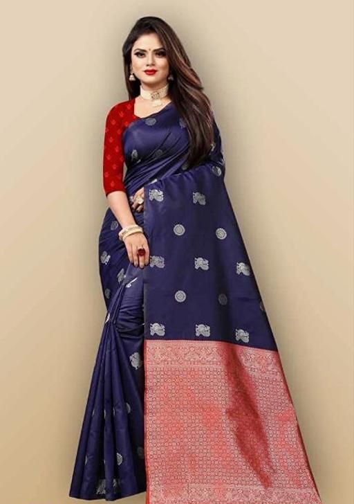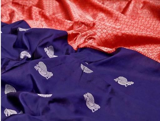 Navy Blue Color Saree With peacock Motif , Saree Comes With 5.3Meter Length plus 0.8 Meter Blouse attached With saree, Saree Blouse and Pallu Will Be Red In Color. Light Weight Art Silk Saree