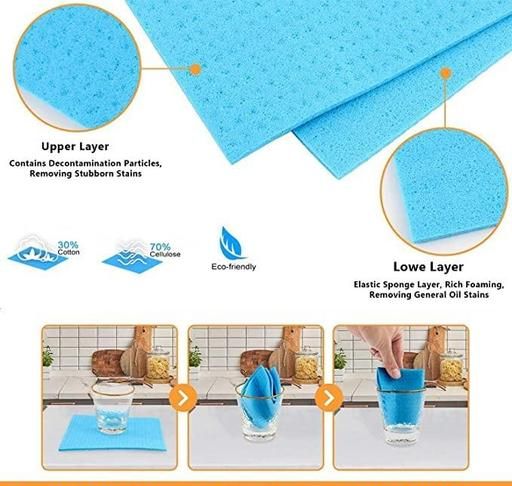 Cleaning dining tables and shining kitchen counters just a swipe away. This is a new and improved way of keeping your precious surface and ensuring it get the special treatment it deserve. The high quality celluloid based material is able to absorb 10 times its weight .The cellulose based sponge cleans any mess in a single swipe and the best part is that it does not leave behind any water marks while swiping.