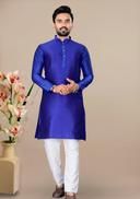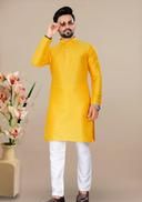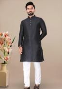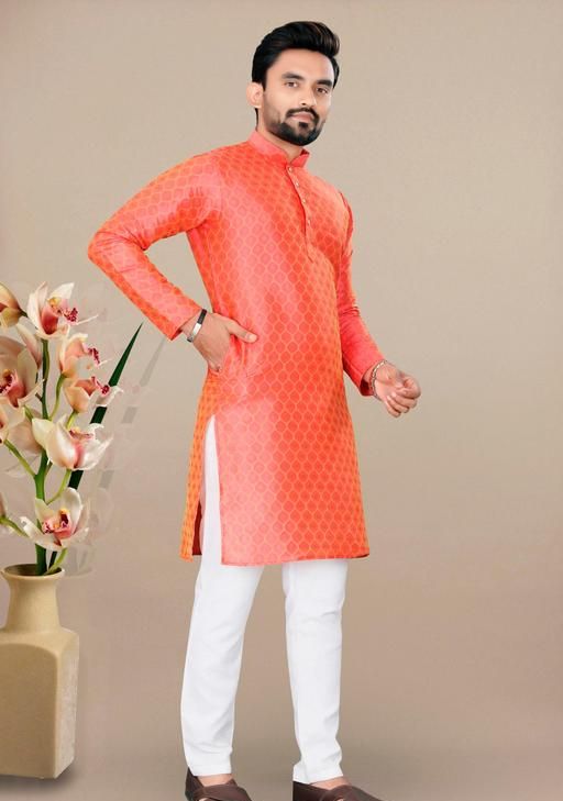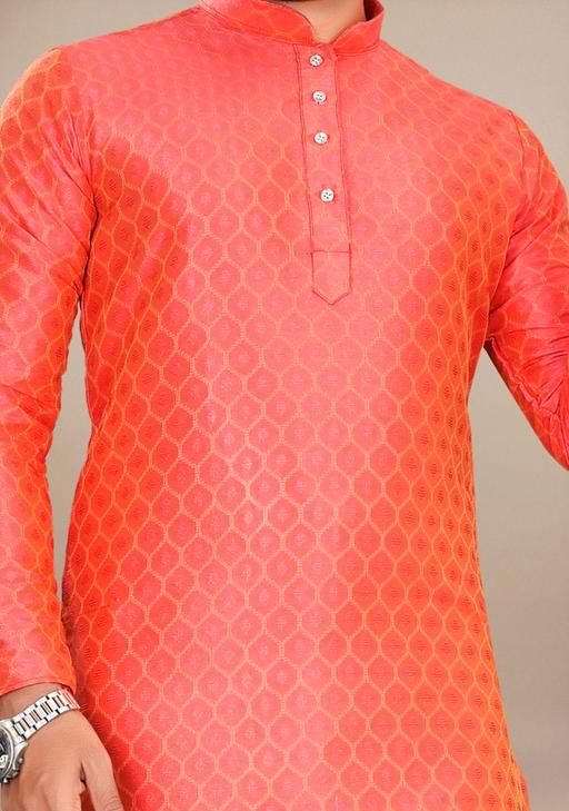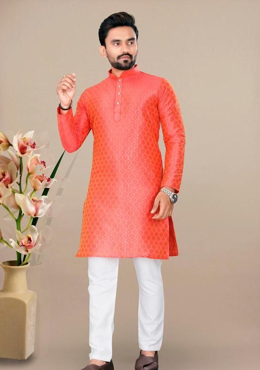 Look your ethnic best wearing this kurta for men.Made from Cotton blend with Jacquard. This regular-fit kurta is a full-sleeved kurta and complete your look. Team this outfit with embroidered mojdi and rock the party that you attend.Kurta Payjama Set.