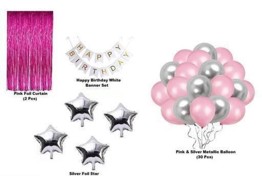 4 Star Combo Set With Pink Silver Balloon 20 Pcs , 2 Pink Curtain