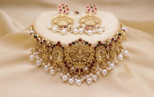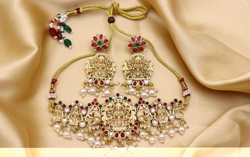 Vivanta design was manufacturer this jewelleryset Bast quality ever and Gold-plated Matte glass drop Temple Style Laxmi Choker Jewlery Set ["earring" "jewellery" "bangle" "necklace" "ring" "mangalsutra" "bracelet" "jewellery set" "jhumka" "anklet" "nosepin" "necklace set"